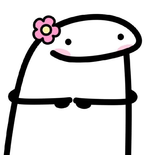 Um desenho simples de um personagem com uma flor rosa na cabeça, sorrindo e com bochechas rosadas.