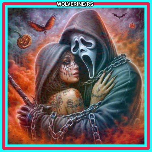 Um casal de personagens de terror, um com máscara de fantasma e o outro com maquiagem de esqueleto, abraçados em um cenário de Halloween com morcegos, lanternas de abóbora e chamas.