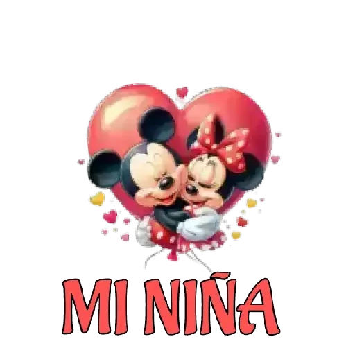 Mickey e Minnie Mouse se beijando em balões em forma de coração, com a frase 'MI NIÑA' embaixo.