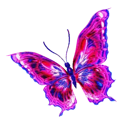 Borboleta rosa e roxa com asas abertas e veias escuras.