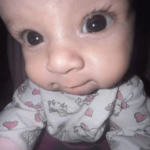 Rosto de bebê com olhos grandes e expressão séria, vestindo uma roupa com corações e desenhos.