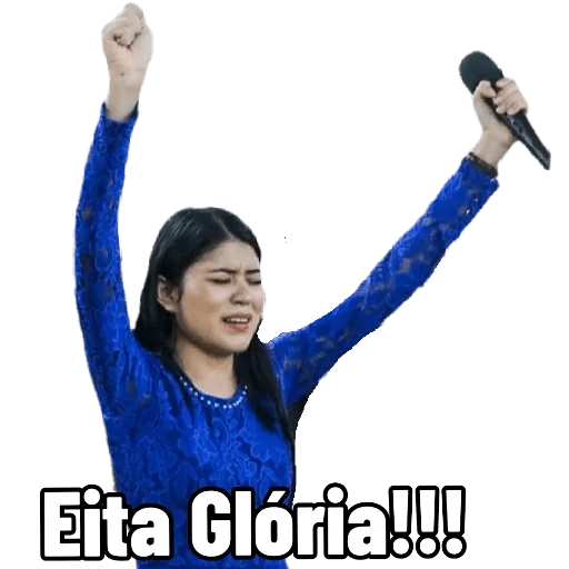 Mulher de cabelo preto, com uma blusa azul, com os braços levantados, um com um microfone e o outro em punho, com o texto 'Eita Glória!!!' embaixo.