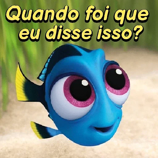 Um peixe azul cartoon com olhos grandes e rosa, parecendo surpreso, com a frase 'Quando foi que eu disse isso?' em amarelo com contorno preto.