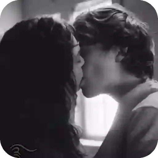 Um casal se beijando, com a mulher à esquerda e o homem à direita, em preto e branco.