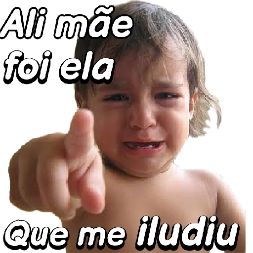 Menino pequeno com expressão séria, apontando o dedo indicador para o espectador. Ele tem texto sobreposto: 'Ali mãe foi ela Que me iludiu'.