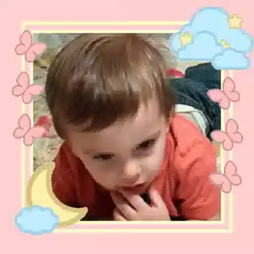Menino pequeno com cabelo castanho e camisa laranja, olhando para baixo com a mão no queixo, cercado por borboletas cor-de-rosa e azuis, nuvens e uma lua amarela em um quadro com fundo rosa.