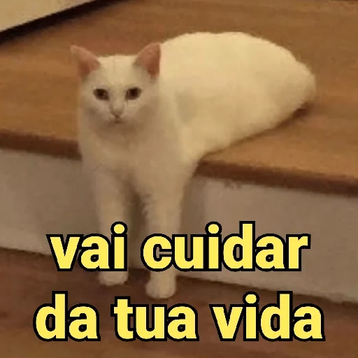 Gato branco sentado em escada de madeira com olhar sério, texto "vai cuidar da tua vida" em amarelo.