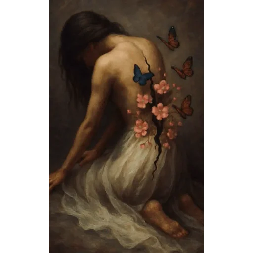Mulher de vestido branco com flores e borboletas coloridas nas costas, sentada com a cabeça baixa.
