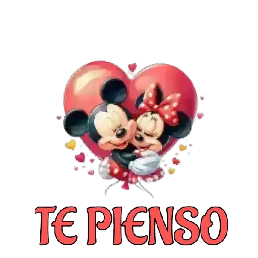 Mickey e Minnie Mouse se beijando dentro de um coração vermelho com balões, rodeados de corações menores. Abaixo deles, está escrito 'TE PIENSO'.