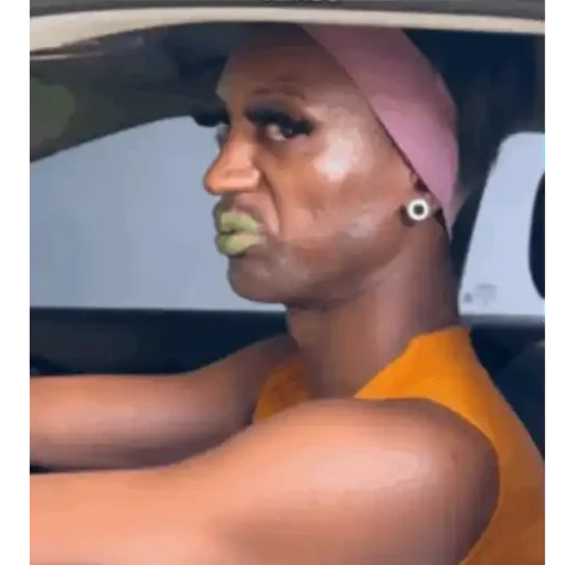 Mulher com chapéu rosa, maquiagem pesada e lábios verdes, dirigindo um carro.