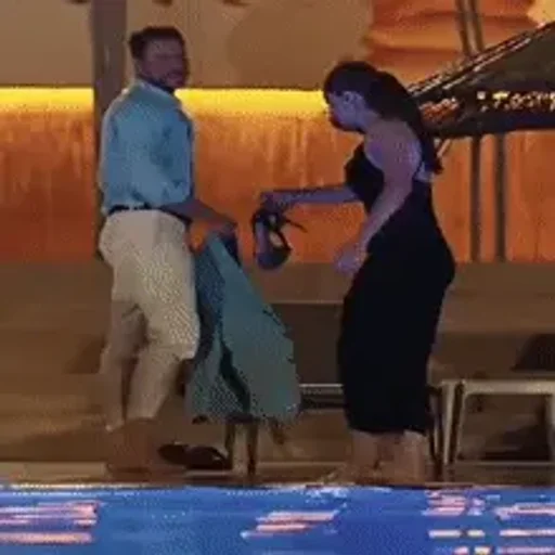 Um casal ao lado de uma piscina, à noite, com o homem vestindo uma camisa azul e calça bege, e a mulher vestindo um vestido preto, com reflexos de luz na água.