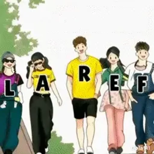 Ilustração de cinco pessoas caminhando, cada uma com uma letra no peito formando a palavra LAREF. Roupas coloridas e cenário com árvores.