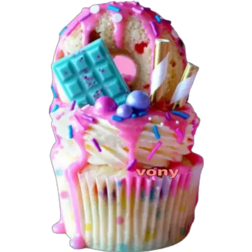 Um cupcake colorido com cobertura branca, decorado com confeitos, chocolate azul, e drizzle de cobertura rosa. O cupcake tem sprinkles na base e na cobertura.