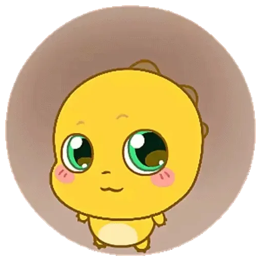 Um dinossauro amarelo fofinho com olhos grandes e verdes, bochechas rosadas e um sorriso leve.