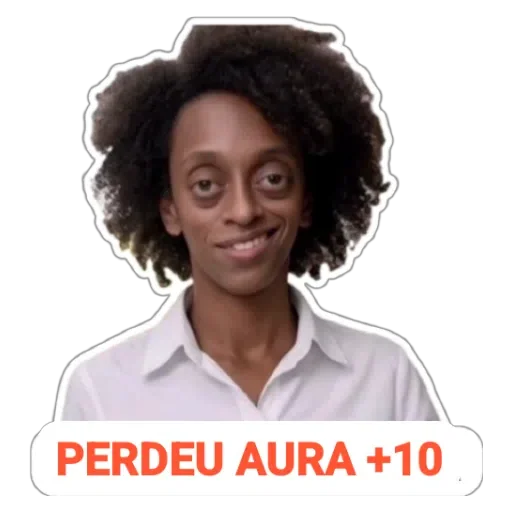 Uma mulher negra com cabelo afro médio, usando uma camisa branca, sorrindo levemente. O texto 'PERDEU AURA +10' está escrito abaixo dela em letras vermelhas.