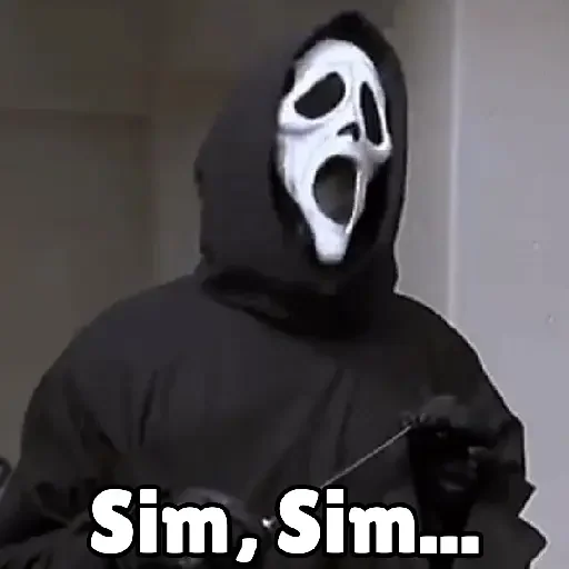 Um personagem de terror com máscara branca e capa preta, parecendo assustado, com o texto 'Sim, Sim...' na parte inferior.