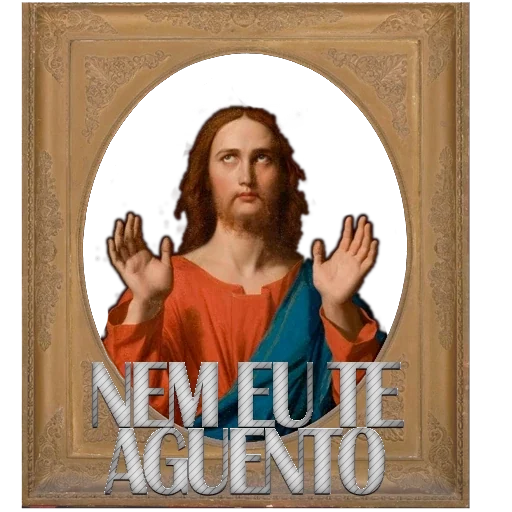 Imagem de Jesus Cristo com as mãos levantadas e um olhar sereno, vestido com uma túnica laranja e azul, dentro de um quadro oval dourado. Sobreposto à imagem, o texto 'NEM EU TE AGUENTO'