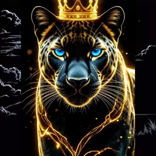 Um tigre preto com olhos azuis brilhantes e uma coroa dourada sobre a cabeça, com linhas de luz dourada ao redor do corpo. O fundo é preto com nuvens brancas.