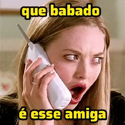 Mulher loira ao telefone com expressão de surpresa e espanto, falando 'que babado é esse amiga'.