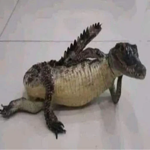 Um lagarto com escamas marrons e cinzas, corpo gordo e cauda longa, em pé sobre um piso branco.