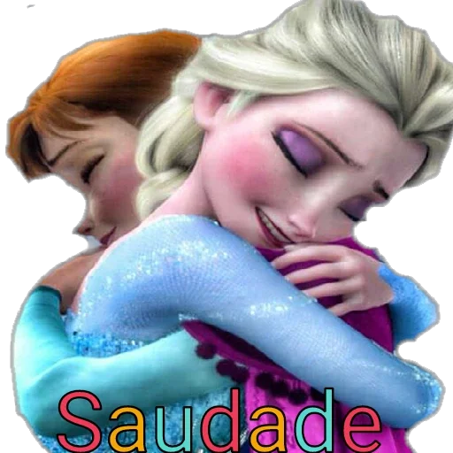 Elsa e Anna de Frozen se abraçando, com o texto 'Saudade' embaixo. Elsa tem cabelo loiro e veste azul e roxo, Anna tem cabelo castanho.