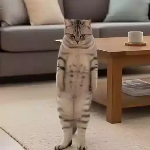 Gato cinza com listras pretas em pé sobre duas pernas, vestindo um macacão bege com botões pretos. Ele está em uma sala com um sofá cinza e uma mesa de madeira com uma xícara.