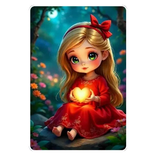 Menina de cabelos loiros e olhos verdes sentada em um jardim noturno, vestindo um vestido vermelho, segurando um coração luminoso nas mãos.