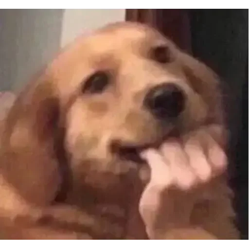 Um cachorro dourado com a pata na boca, parecendo pensativo ou confuso.