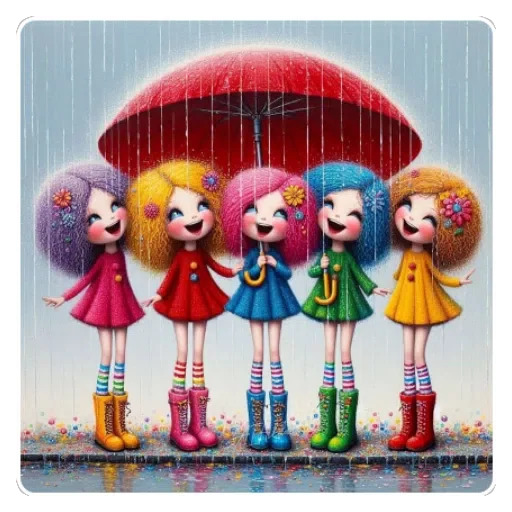 Cinco meninas coloridas com diferentes cores de cabelo e roupas estão em pé sob um guarda-chuva vermelho enquanto chove. Todas estão sorrindo e usando botas de chuva.