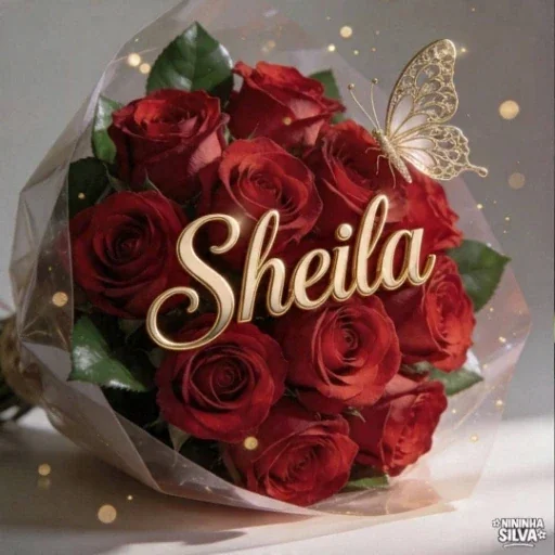 Um buquê de rosas vermelhas com o nome 'Sheila' em letras douradas no centro. O buquê é envolvido em papel transparente e decorado com uma borboleta dourada e pontos dourados.