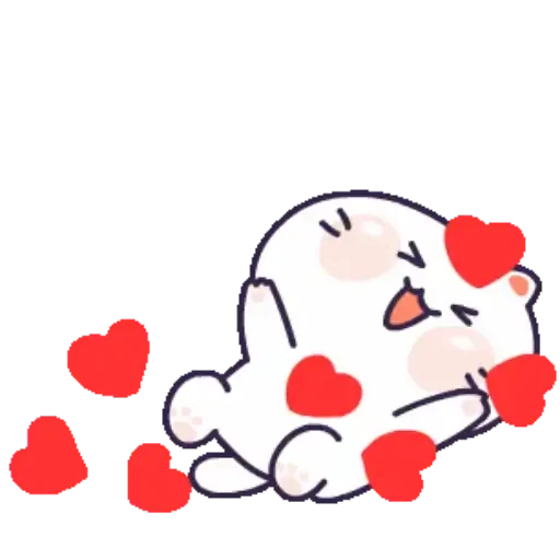Um gato branco de desenho animado com corações vermelhos ao redor, parecendo sonhando ou com sono.