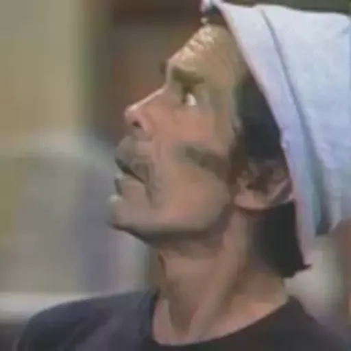 Homem com toalha na cabeça olhando para cima com expressão surpresa ou confusa.