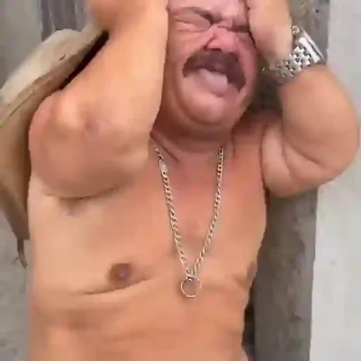 Homem sem camisa, com correntes e relógio, cobrindo o rosto com as mãos e expressão de dor ou choque.