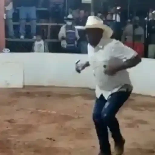 Homem dançando em um rodeio, usando um chapéu branco e camisa branca, com calça jeans e botas, em um fundo de terra e espectadores.