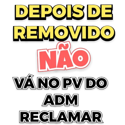 Uma figurinha com texto colorido que diz 'DEPOIS DE REMOVIDO NÃO VÁ NO PV DO ADM RECLAMAR'.