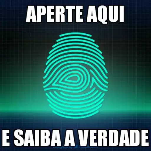 Uma impressão digital verde brilhante com linhas onduladas, texto 'APERTE AQUI E SAIBA A VERDADE' em branco.