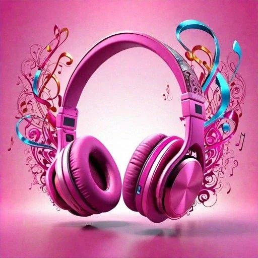 Um par de fones de ouvido rosa com elementos musicais coloridos ao redor, incluindo notas musicais e linhas onduladas.