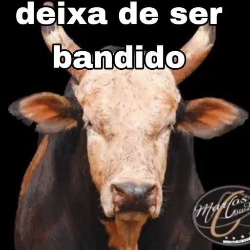 Um boi com chifres e focinho preto olha para frente com expressão séria, com as palavras 'deixa de ser bandido' sobrepostos em branco.