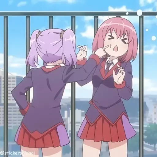 Duas garotas de anime com cabelos roxos e rosa, vestindo uniformes escolares, uma de costas e a outra de frente, com expressão surpresa. Fundo com grades e cidade ao longe.