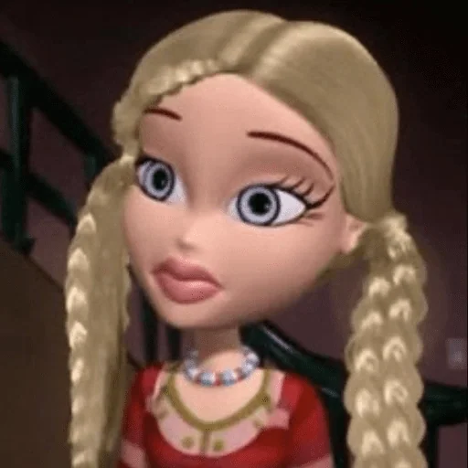 Uma menina de olhos azuis e cabelos loiros com tranças, vestindo uma blusa vermelha e um colar. Ela parece surpresa ou confusa.