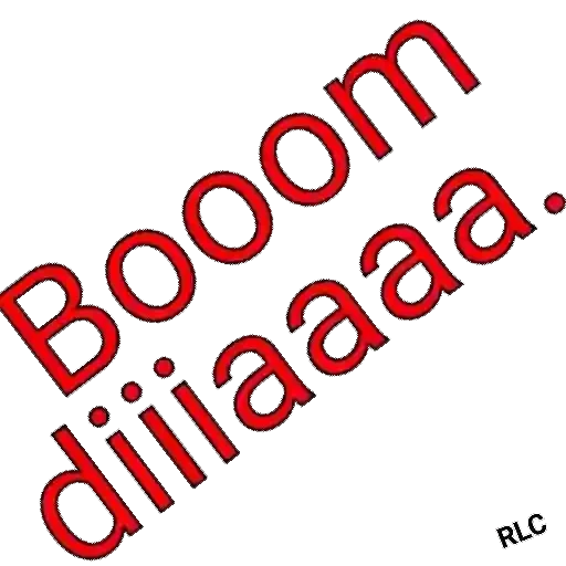 Um texto em vermelho inclinado que diz 'Booom diiiaaaa.' com letras grandes e o código 'RLC' no canto inferior direito.
