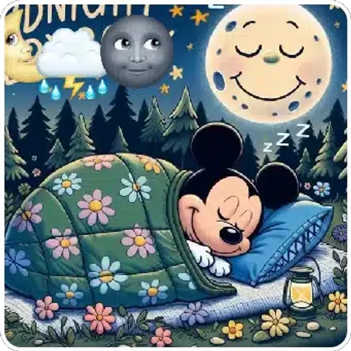 Mickey Mouse vestida de rosa, com laço rosa na cabeça, em frente à lua cheia, rodeada de flores rosas e borboletas.