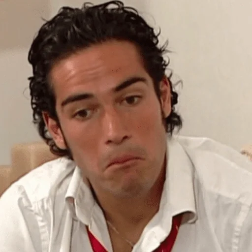Homem com expressão séria, cabelo preto e camisa branca com colarinho aberto, mostrando um colar vermelho.