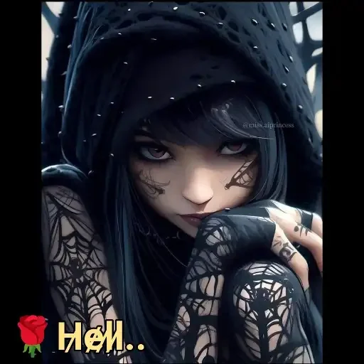 Uma mulher com cabelos pretos e olhos escuros, vestida com uma roupa preta com padrões de teia de aranha, olhando para baixo com expressão séria. Ela está com uma mão perto do rosto e tem a palavra 'Hell...' escrita em amarelo no canto inferior esquerdo.