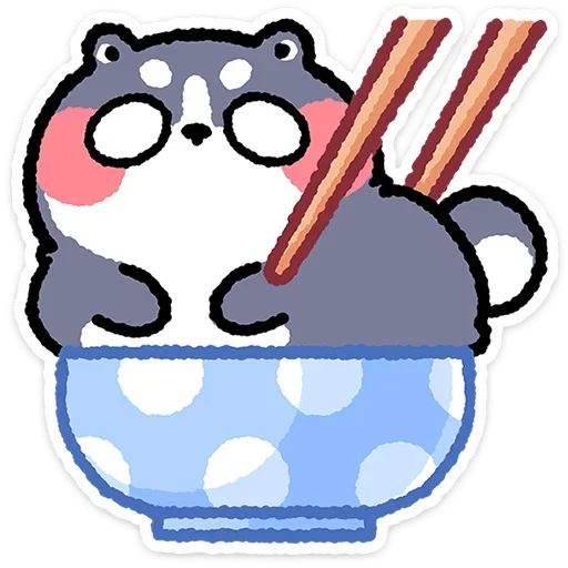 Um desenho de um animal cinza com orelhas pequenas e bochechas rosadas, dentro de uma tigela azul com manchas brancas, segurando dois pauzinhos.