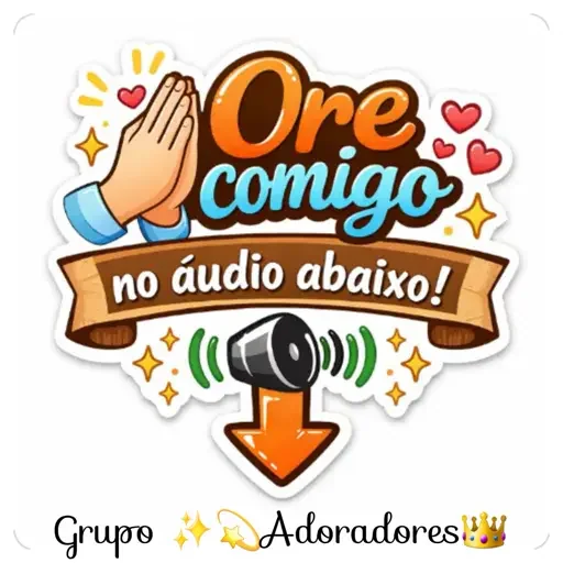 Mãos juntas em oração com texto 'Ore comigo no áudio abaixo!' e um alto-falante emitindo som, cercados de estrelas e corações.