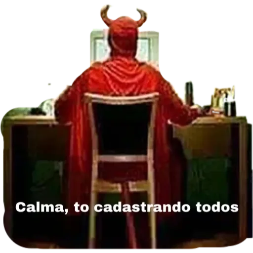Um demônio vermelho com chifres sentado em uma cadeira, de costas para uma mesa com um computador, com a legenda 'Calma, to cadastrando todos'.