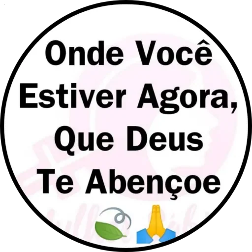 Um círculo branco com texto preto que diz 'Onde Você Estiver Agora, Que Deus Te Abençoe' e pequenos ícones coloridos na parte inferior.