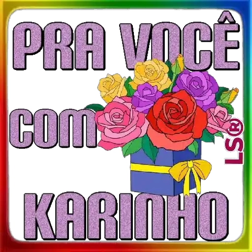 Um buquê de rosas coloridas em um vaso azul com laço amarelo, com o texto 'PRA VOCÊ com KARINHO'.