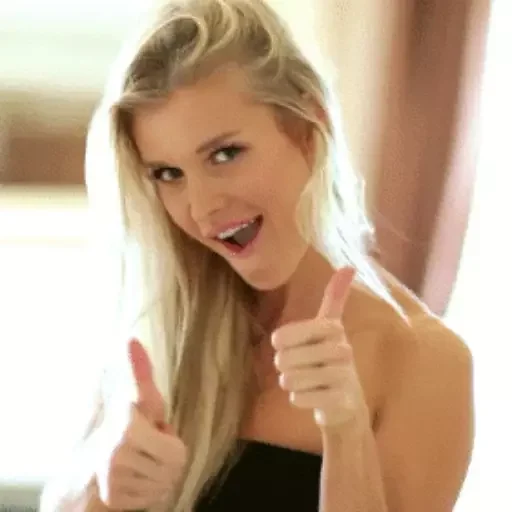 Mulher loira sorrindo e fazendo dois gestos de aprovação com os polegares para cima.